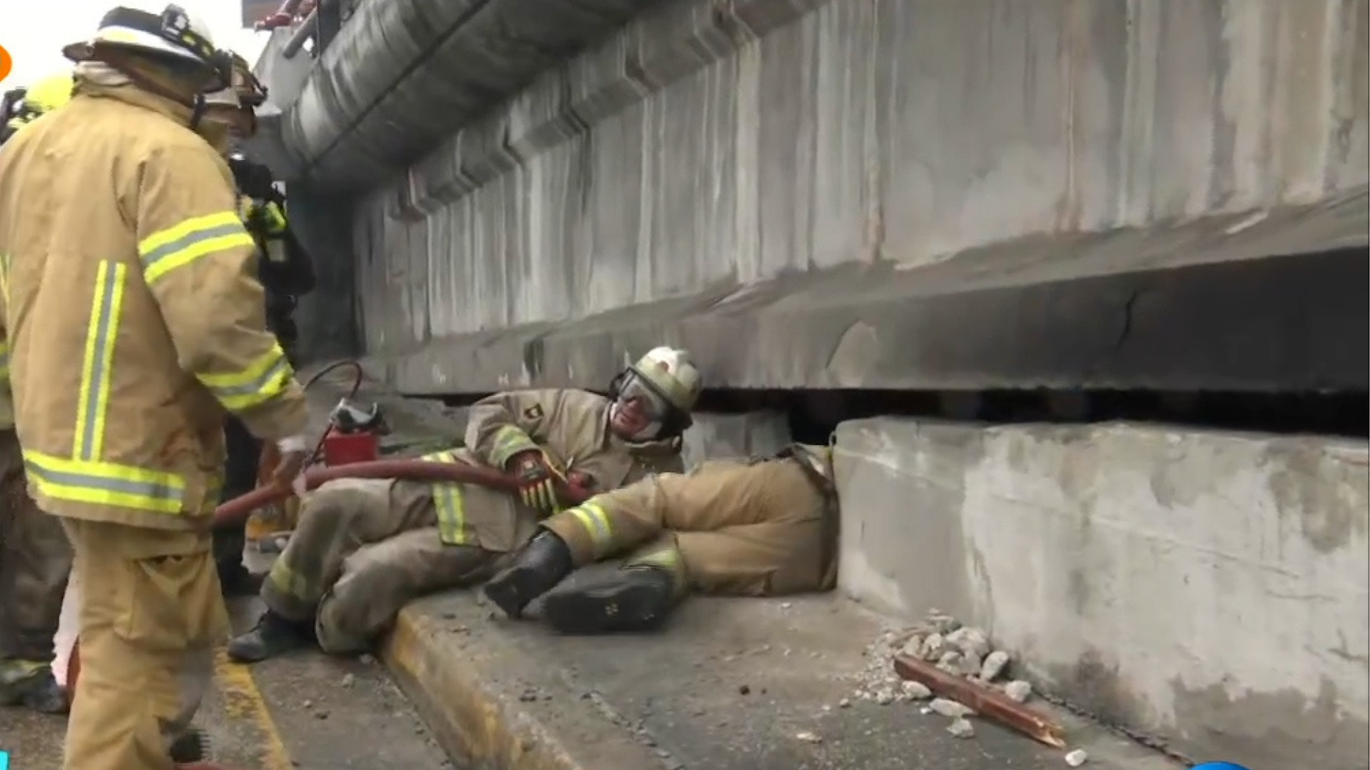 Los bomberos han sacado una parte del concreto del puente para ingresar al interior y controlar las llamas que ya han calentado el asfalto del puente. Autoridades aseguran que no hay riesgo de un colapso de la estrutura.