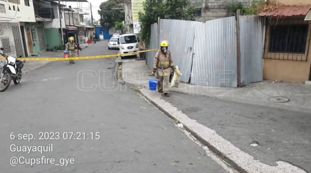 El Cuerpo de Bomberos de Guayaquil se encuentra en el sector de La Prosperina haciendos trabajos de contención por derrame de cloro en polvo que se encontraba en grandes cantidades dentro de sacos almacenados en una vivienda.