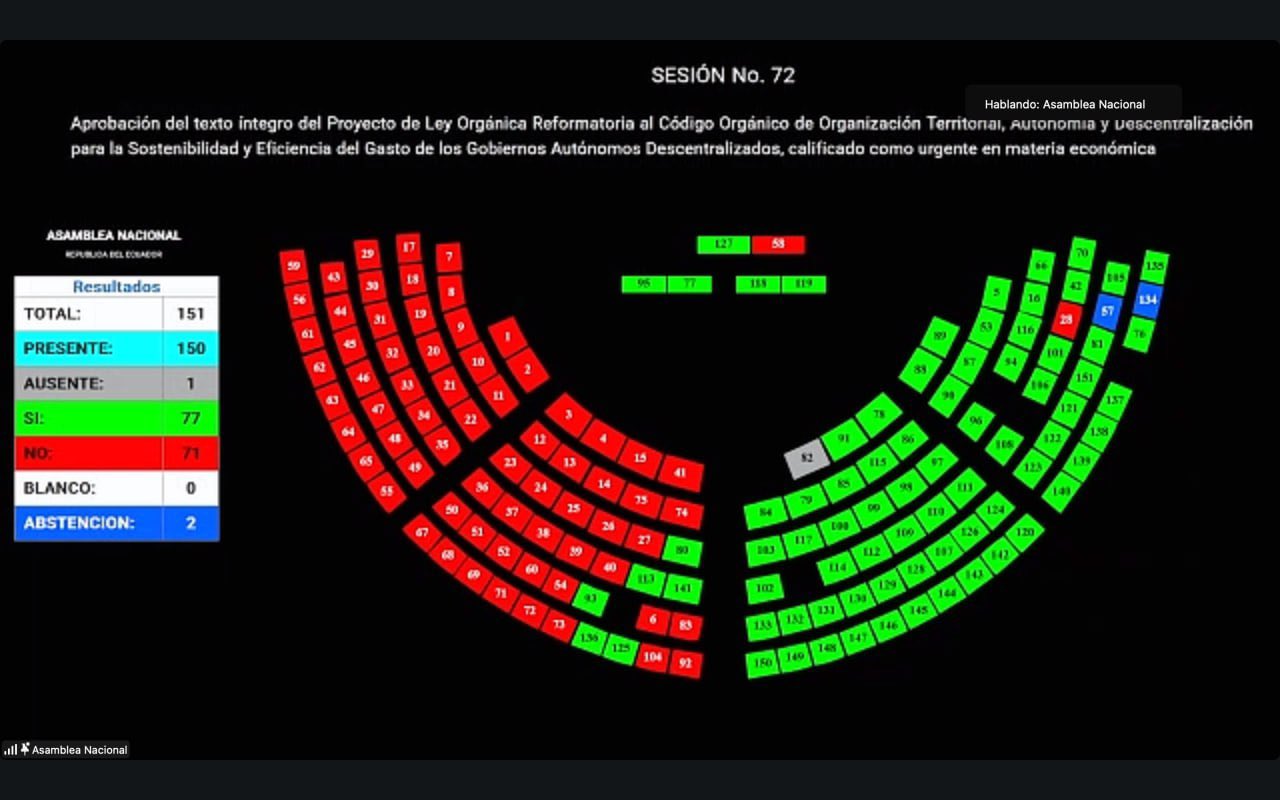 Con 77 votos a favor, la Asamblea Nacional del Ecuador aprobó este 20 de febrero de 2026 la Ley de Sostenibilidad y Eficacia del Gasto de los Gobiernos Autónomos Descentralizados (GAD), un proyecto enviado con carácter económico urgente por el presidente Daniel Noboa.