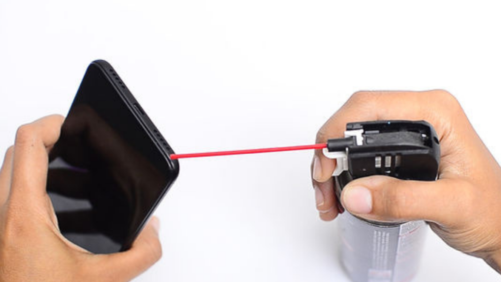 Desactiva el teléfono y desenchufa cualquier cable o audífono. Así reduces el riesgo de dañar componentes si se mueve algo de polvo.
