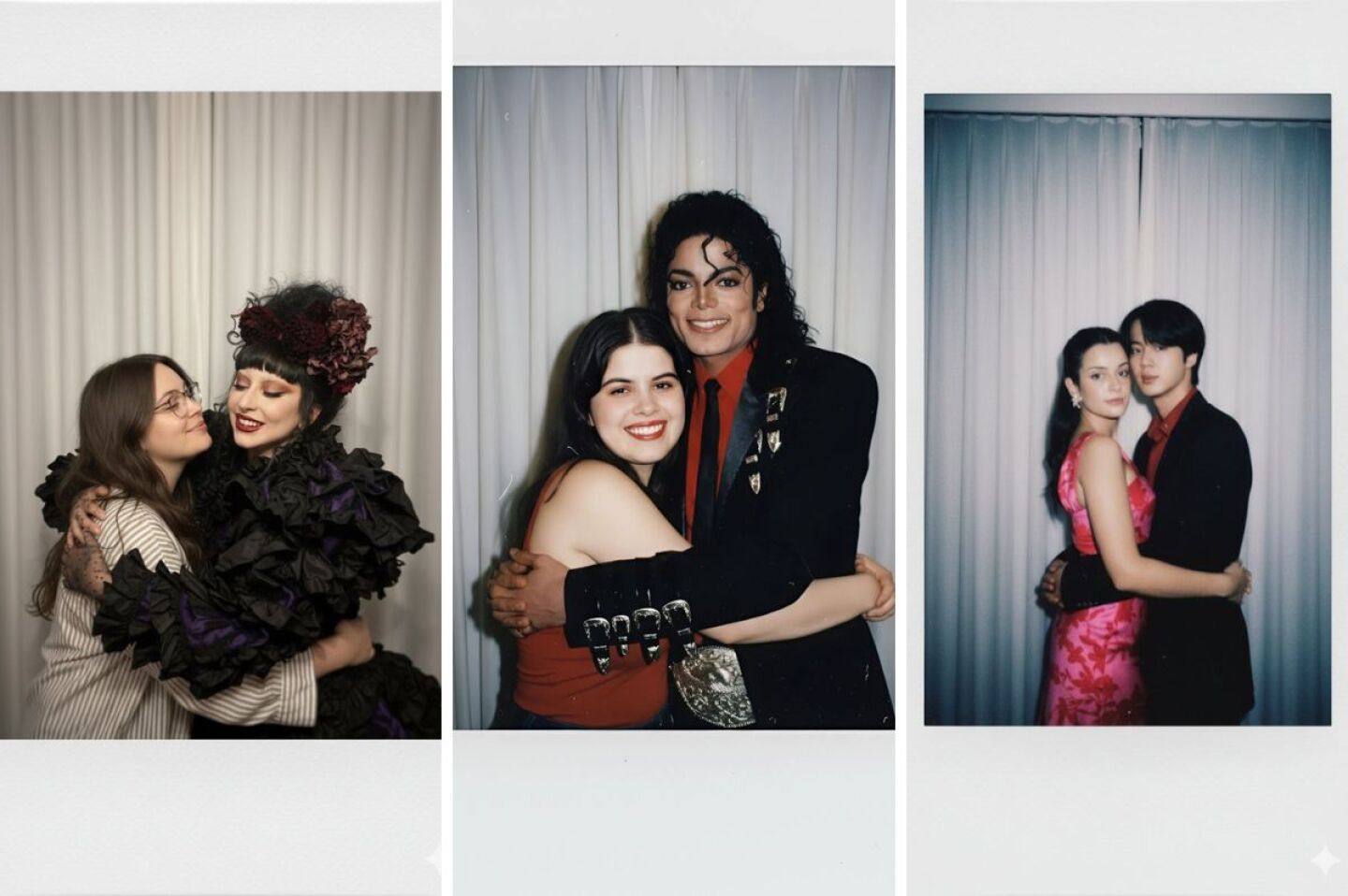 “Toma una foto con una cámara Polaroid. La foto debe verse como una fotografía normal, sin un sujeto ni una propiedad explícita. Debe estar ligeramente desenfocada y tener una fuente de luz constante, como un flash en una habitación oscura, dispersa por toda la foto. No cambies la cara. Cambia el fondo detrás de esas dos personas con cortinas blancas. Con esos hombres abrazándose.” Con estas instrucciones, el modelo genera una foto estilo Polaroid, con flash, ligero desenfoque y fondo específico, manteniendo intactos los rostros.