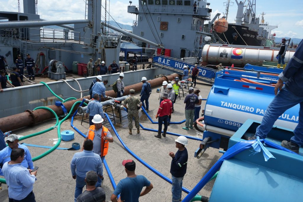 Las Fuerzas Armadas del Ecuador, a través de la Armada Ecuatoriana, han desplegado un operativo logístico para mitigar el impacto del desabastecimiento de agua en Esmeraldas, provocado por el derrame de crudo en el sector. Como parte de esta acción, tres buques de la Escuadra Naval transportarán más de 550.000 galones de agua potable para abastecer a la población afectada.