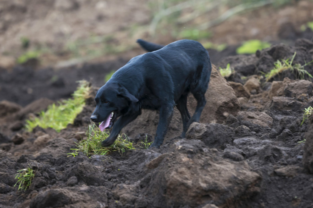 Él es Jacob, el perro que camina, olfatea y escarba en búsqueda de su familia que desapareció tras el deslizamiento en Alausí ocurrido el pasado domingo, 26 de marzo de 2023.