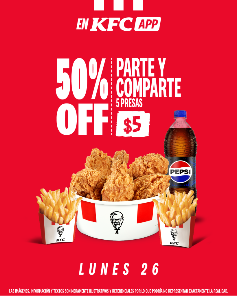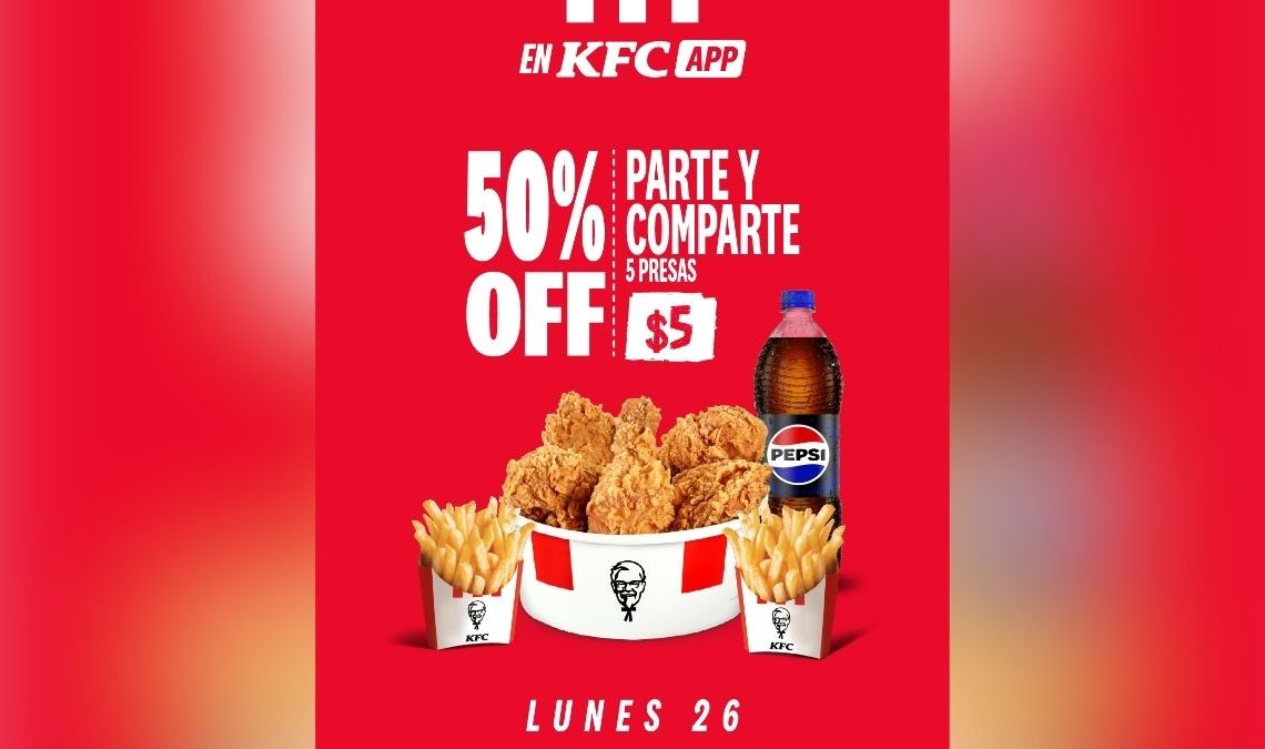 KFC activó una promoción por un solo día: este lunes 26 de enero podrás pedir el Parte y Comparte (cinco presas de pollo con papas y bebida) con 50% de descuento.