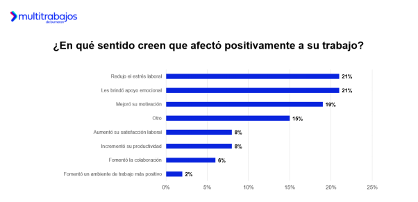 Para 60% la relación tuvo un efecto positivo. Lo que más mencionan: menos estrés (21%), más apoyo (21%) y más motivación (19%).