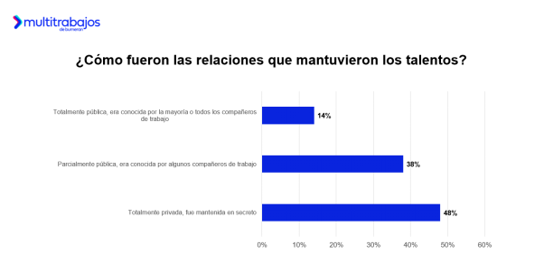Aquí viene lo curioso: 48% mantuvo la relación en secreto. Un 38% la dejó “a medias” (solo algunos lo sabían) y apenas 14% fue totalmente pública.