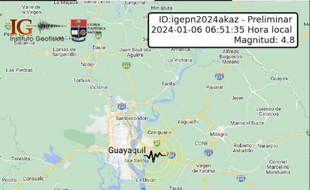 Un sismo de magnitud 4.8 se registró la mañana de este sábado 6 de enero de 2024. El epicentro se reportó en el cantón Durán, provincia del Guayas, a las 06H:51 AM, según el reporte del Instituto Geofísico.
