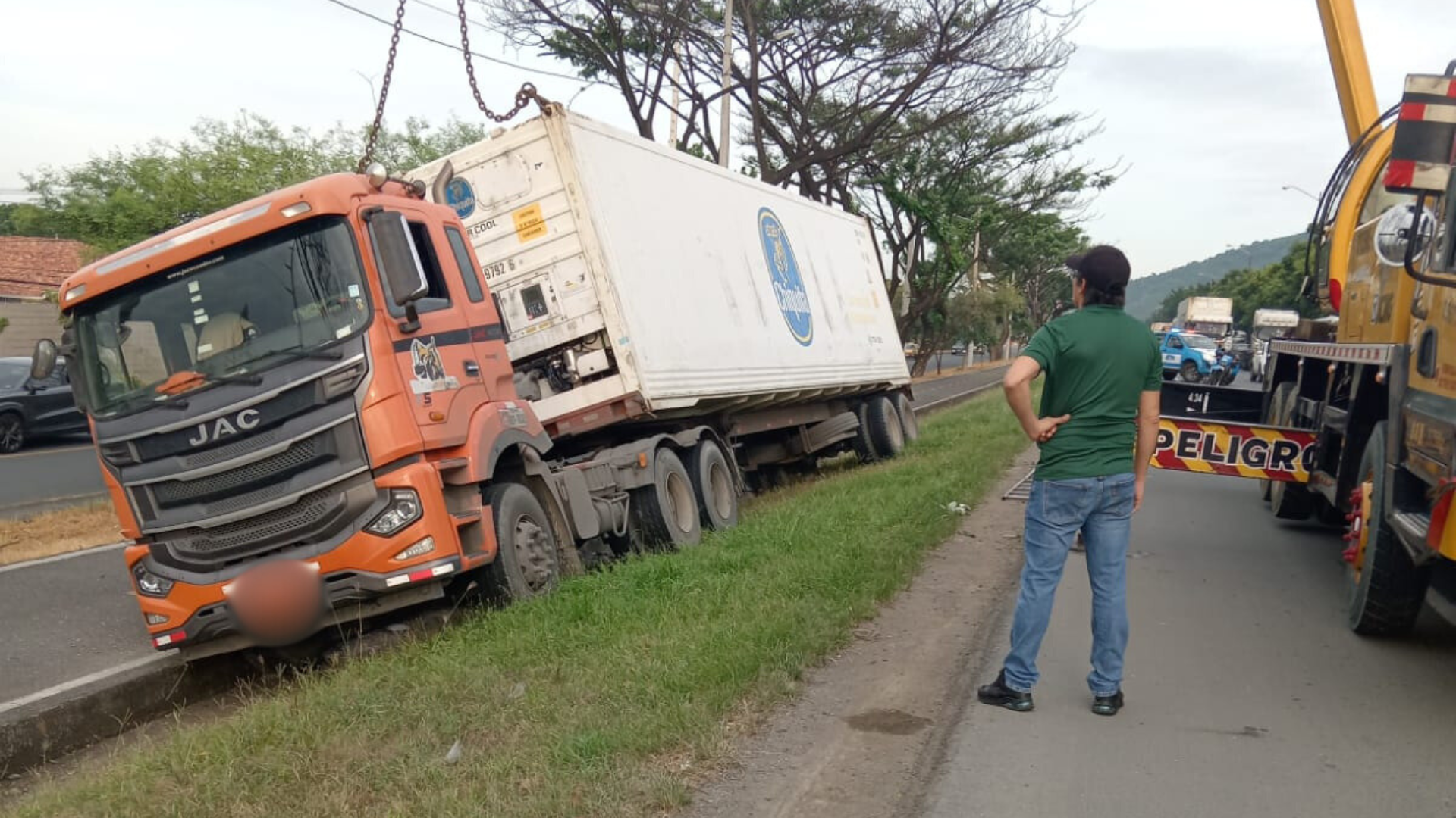 Durante la madrugada de este miércoles, 27 de marzo de 2024, a la altura del km 10 de la Vía a la Costa un tráiler que, aparentemente transportaba banano, quedó atrapado en una zanja tras perder pista.