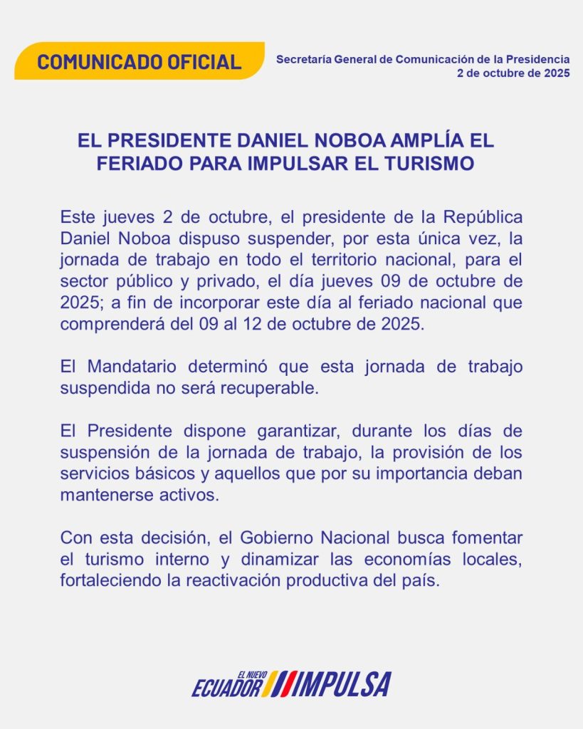El presidente de la República, Daniel Noboa, dispuso la suspensión de la jornada laboral del jueves 9 de octubre de 2025, tanto en el sector público como en el privado. Con esta decisión, el feriado nacional se extenderá del 9 al 12 de octubre.