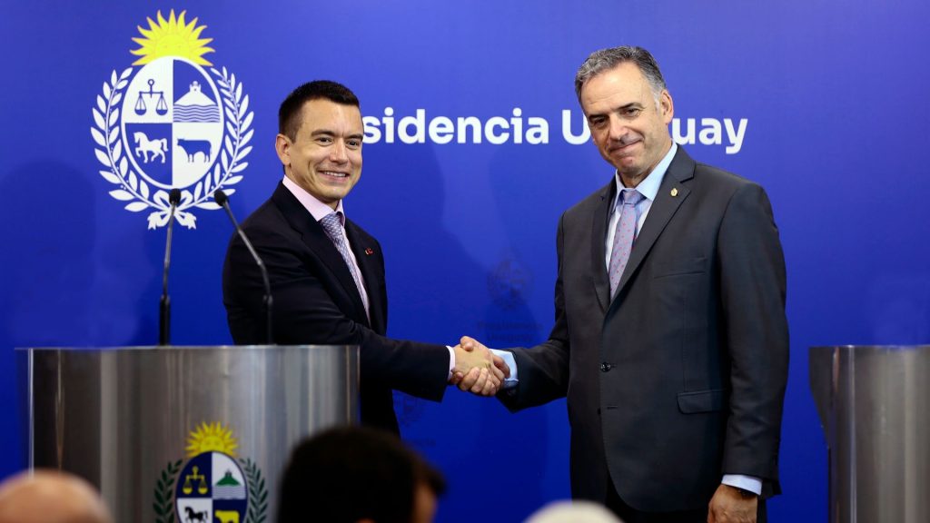 El presidente Daniel Noboa cumplió este martes una agenda oficial en Uruguay, donde se reunió con su homólogo Yamandú Orsi en la Torre Ejecutiva de Montevideo. El mandatario ecuatoriano fue recibido con honores militares a su llegada.