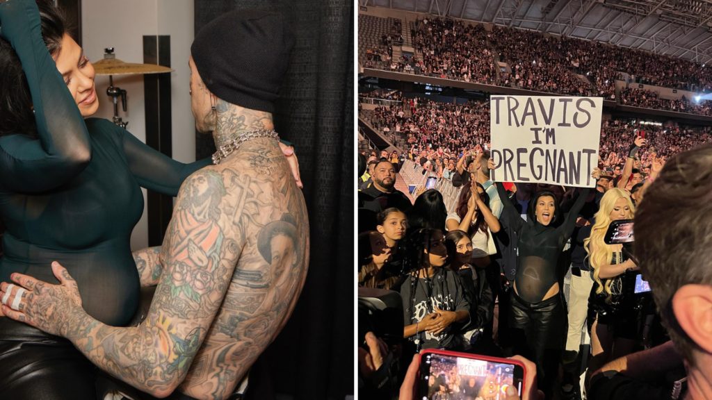 Durante un concierto de Blink-182, la banda en la que Barker se desempeña como baterista, Kourtney levantó un cartel que sorprendió a toda la multitud presente y al propio futuro padre. “Travis, estoy embarazada”, decía.