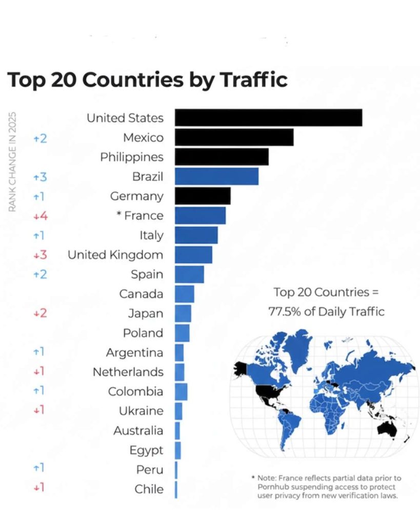 Otros países europeos como Francia, Reino Unido, Italia y España, además de Canadá, completan el top 10. Sin embargo, algunos de ellos se han visto afectados por nuevas normas de verificación de edad. Esto ha modificado el comportamiento de acceso durante el año.