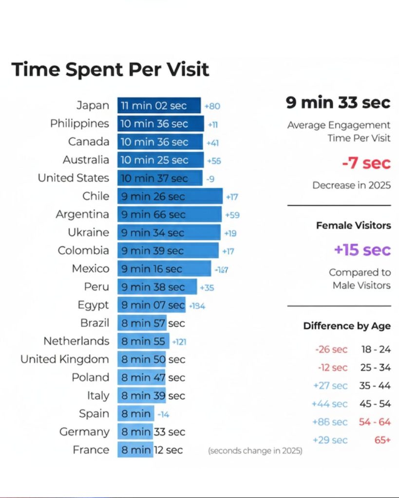 - El promedio mundial en 2025 fue de 9 minutos con 33 segundos por visita.