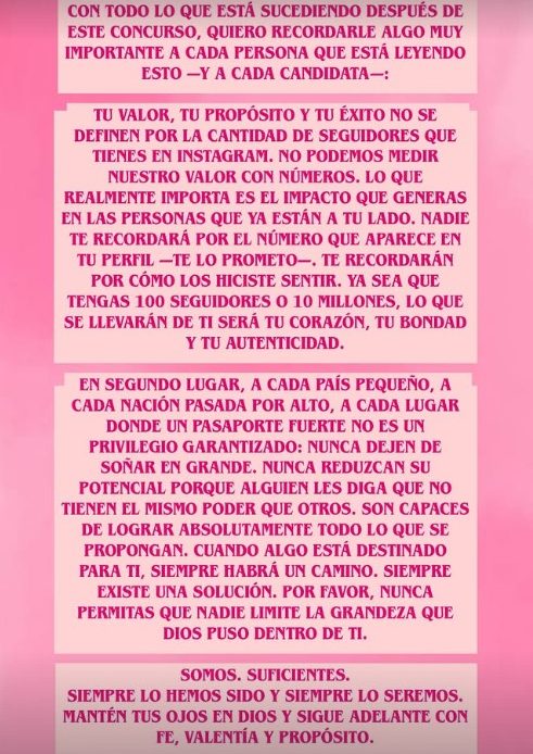 La representante ecuatoriana también cuestionó la relevancia que, según señaló, se ha dado al número de seguidores y al alcance digital como criterios no oficiales dentro del certamen. Afirmó que estos elementos no deberían definir el valor ni el potencial de ninguna concursante, resaltando la importancia del impacto humano y la autenticidad por encima de métricas superficiales.
