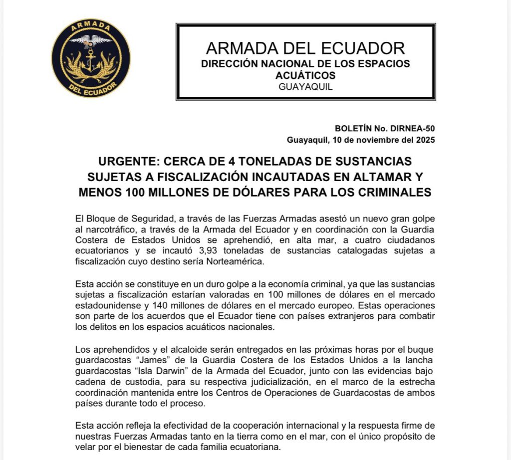Las Fuerzas Armadas del Ecuador, a través de la Armada Nacional y en coordinación con la Guardia Costera de Estados Unidos, incautaron cerca de cuatro toneladas de sustancias sujetas a fiscalización durante un operativo realizado en altamar. En la acción fueron detenidos cuatro ciudadanos ecuatorianos, quienes transportaban la carga con destino a Norteamérica.