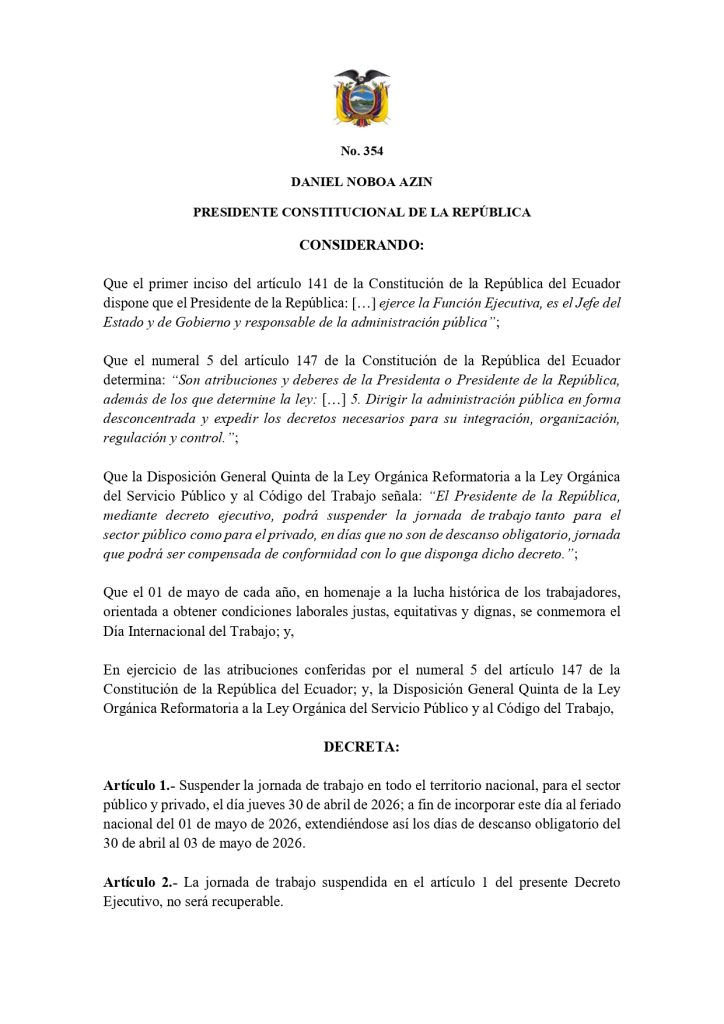 El presidente Daniel Noboa dispuso la suspensión de la jornada laboral del jueves 30 de abril de 2026. La medida aplica para el sector público y privado. Con esta decisión, el feriado por el Día del Trabajo se extenderá del 30 de abril al 3 de mayo.