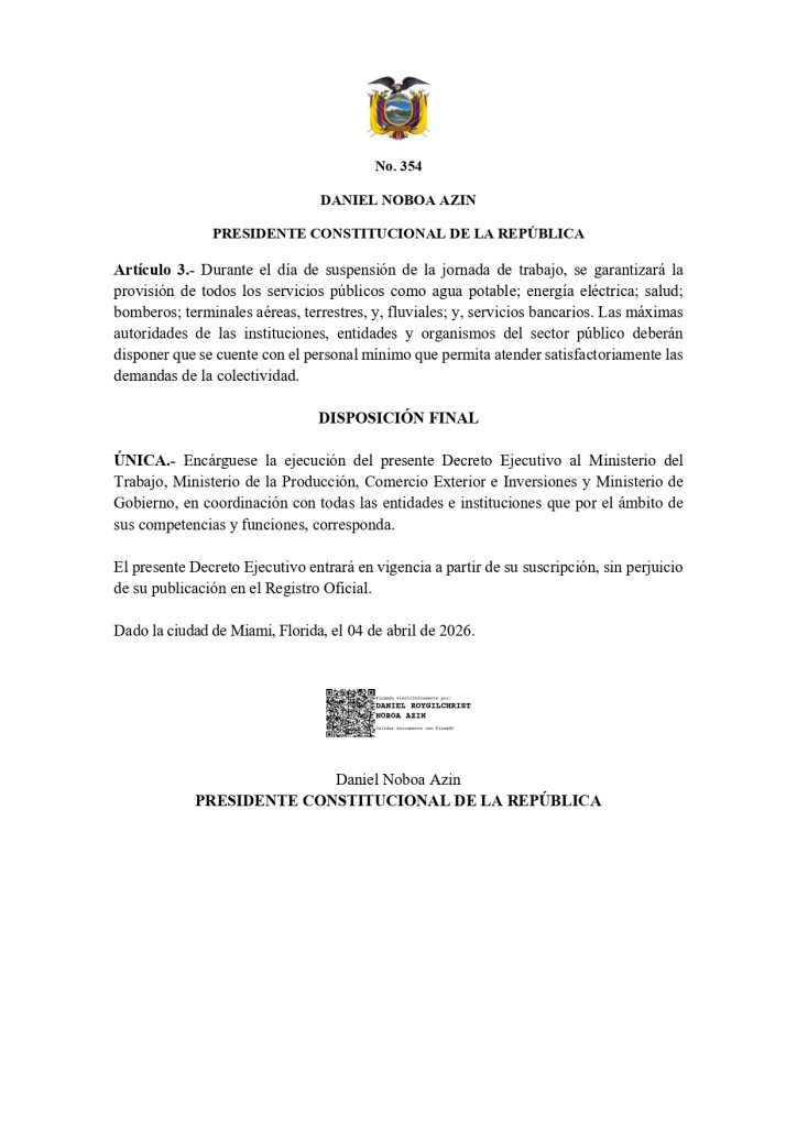 La decisión consta en el Decreto Ejecutivo 354, firmado este 4 de abril de 2026, el documento señala que la jornada suspendida no será recuperable. También indica que el decreto entra en vigencia desde su suscripción.