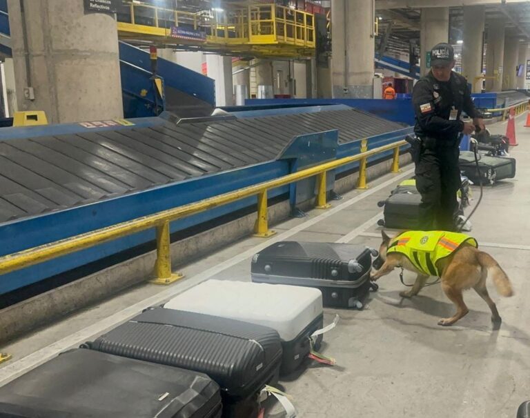 Más de 20.000 gramos de cocaína fueron detectados por la Policía Nacional durante una inspección antinarcóticos en el área del túnel de equipajes del Aeropuerto Mariscal Sucre, en Tababela, Quito. El hallazgo se produjo en un vuelo con ruta Quito–Guayaquil–Ámsterdam, cuando los agentes identificaron una maleta que contenía prendas húmedas impregnadas con sustancias sujetas a fiscalización. En la intervención, una persona fue aprehendida.