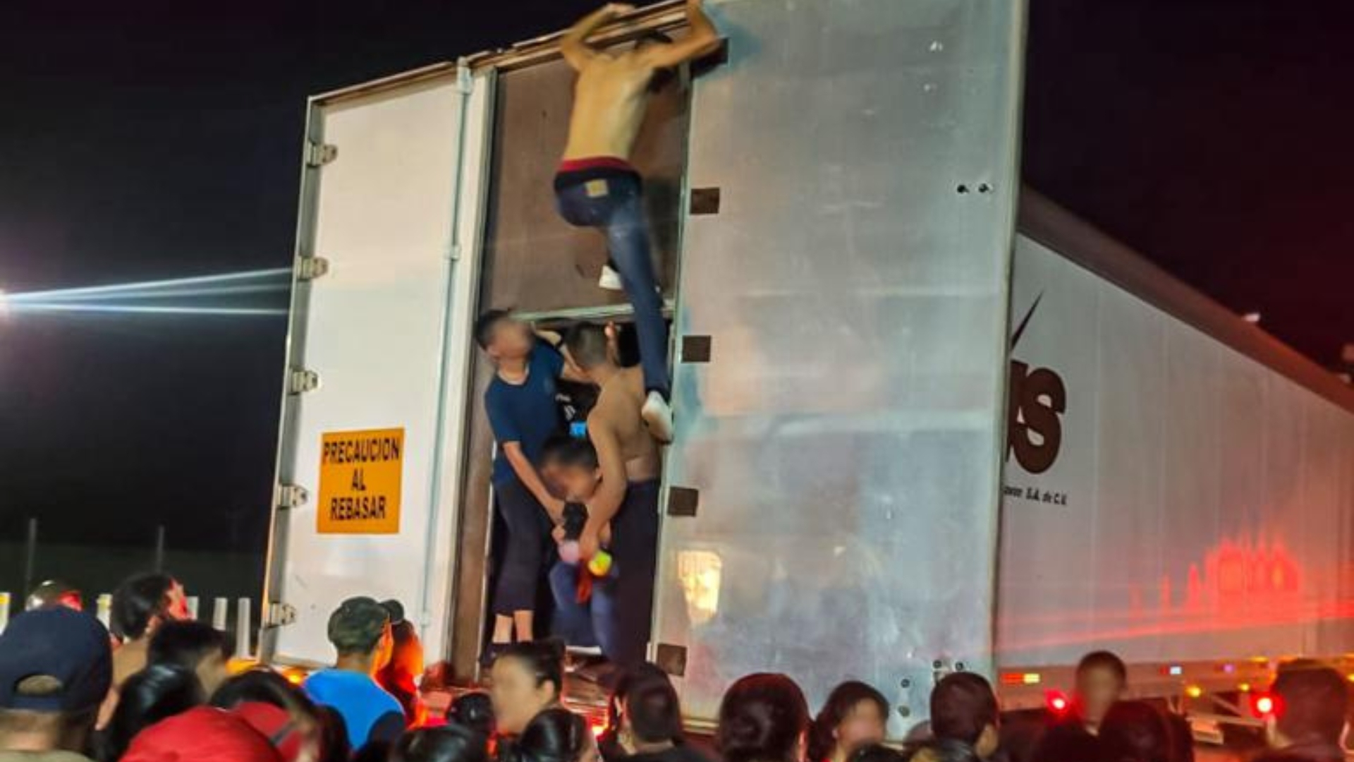 En un comunicado, la entidad explicó que junto con elementos de seguridad se escucharon gritos y golpes en la puerta trasera de la caja y tras romper los sellos, los migrantes movieron una mampara que les impedía el ingreso de aire.
