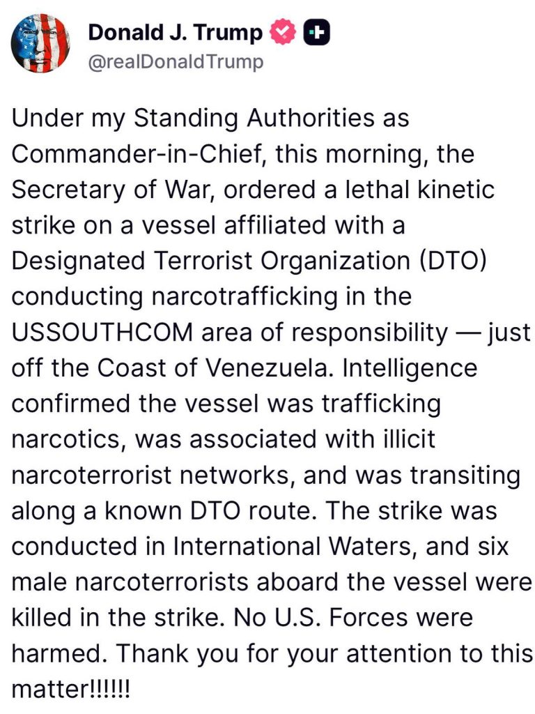 El presidente estadounidense, Donald Trump, confirmó que bajo su autoridad como Comandante en Jefe, Estados Unidos llevó a cabo un ataque letal contra una embarcación vinculada a una organización terrorista designada, dedicada al narcotráfico, frente a la costa de Venezuela.