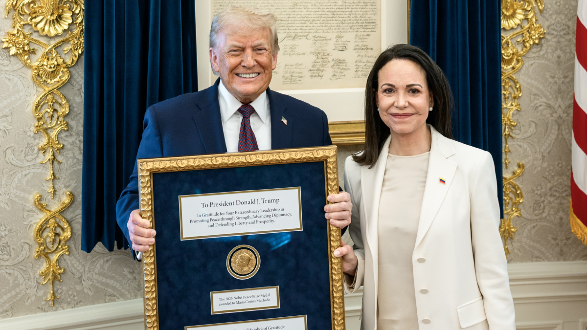 María Corina Machado obsequió la prestigiosa presea enmarcada con un mensaje de «gratitud» en nombre del pueblo venezolano. En el marco con detalles dorados, la fundadora de Vente Venezuela escribió que el gesto reconoce el «extraordinario liderazgo» de Trump para promover la paz y encaminar la libertad del país sudamericano.