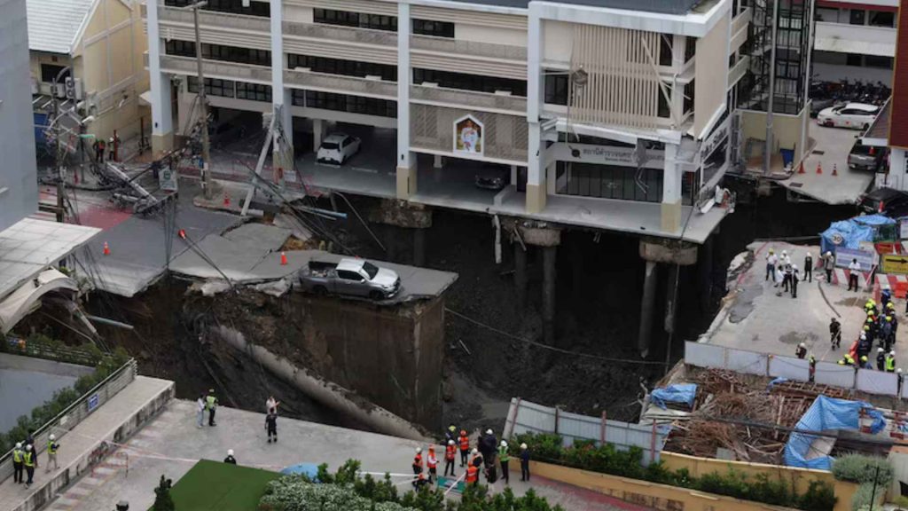El gobernador de Bangkok, Chadchart Sittipunt, explicó que el hundimiento se produjo tras el derrumbe de un túnel ferroviario subterráneo, que provocó el desplazamiento del terreno. La situación empeoró con la rotura de tuberías de agua, que aceleraron el deslizamiento del suelo.