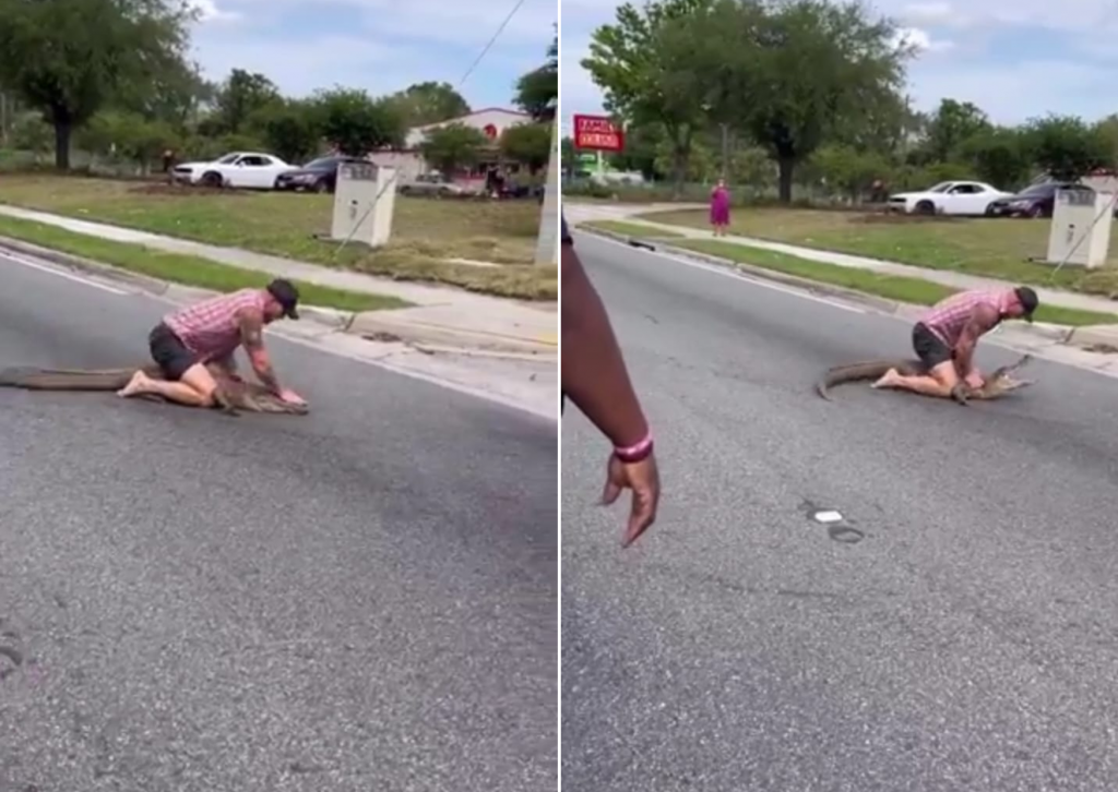 Descalzo y con determinación, Dragich se aproximó al reptil, agarrándolo hábilmente por detrás. Con un movimiento rápido, aseguró la boca del caimán con sus manos para prevenir cualquier mordida.
