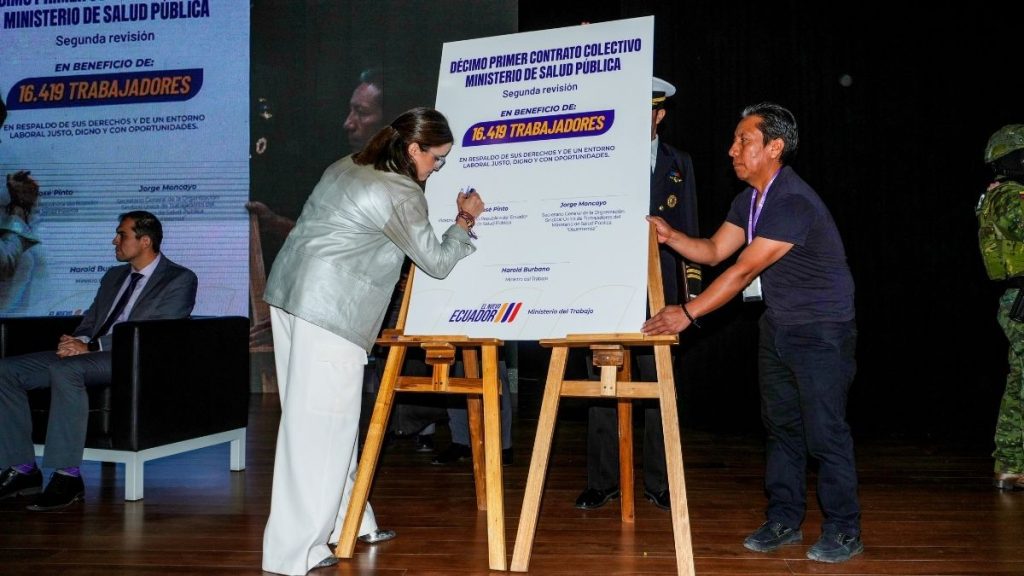 El Gobierno del presidente Daniel Noboa oficializó este 10 de diciembre de 2025 la segunda revisión del Décimo Primer Contrato Colectivo entre el Ministerio de Salud Pública (MSP) y la Organización Sindical Única Nacional de Trabajadores del Ministerio de Salud (OSUNTRAMSA). Con esta firma, 16.419 trabajadores de la salud reciben beneficios laborales y garantías de estabilidad.