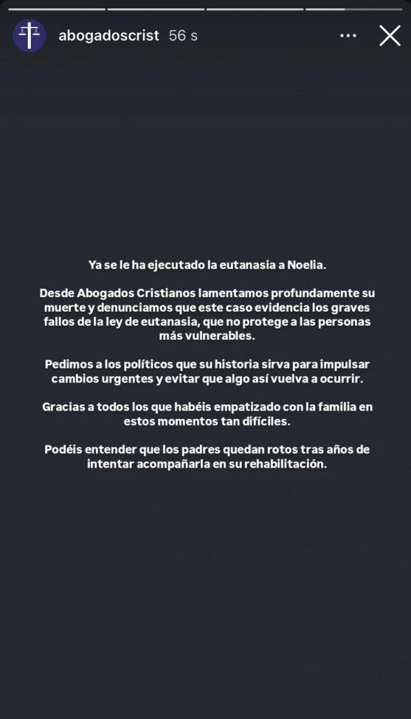 La solicitud de Noelia fue aprobada en 2024 por la Comisión de Garantía y Evaluación de Cataluña. Sin embargo, su padre presentó recursos con apoyo de Abogados Cristianos. Eso retrasó el procedimiento durante 601 días. El caso pasó por el Tribunal Supremo, el Tribunal Constitucional y el Tribunal Europeo de Derechos Humanos. Este último rechazó frenar la eutanasia en marzo de 2026.