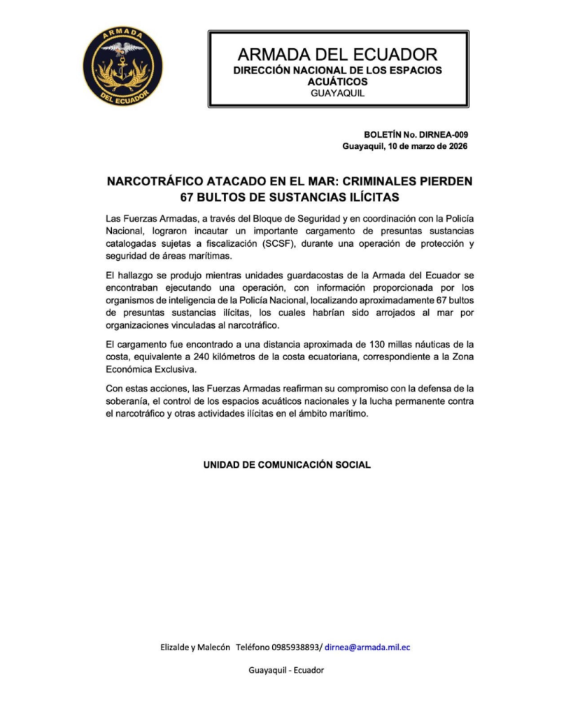 De acuerdo con el reporte oficial, las autoridades hallaron 67 bultos flotando en el mar. Las organizaciones criminales habrían arrojado la mercancía al agua al notar la presión de los controles marítimos y verse acorralados por las unidades de intercepción. Por consiguiente, esta acción debilita significativamente las economías criminales que financian el tráfico de drogas en la región.