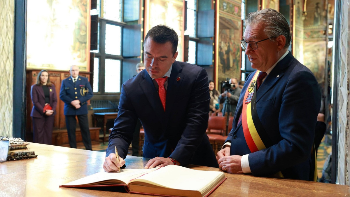 Este sábado 24 de enero, el Presidente Daniel Noboa Azin fue recibido en la Alcaldía de Brujas por el burgomaestre Dirk De Fauw. Durante el encuentro, el Primer Mandatario firmó el Libro Dorado de la ciudad, un gesto protocolario que simboliza el estrechamiento de los lazos de cooperación y amistad entre Ecuador y Bélgica.