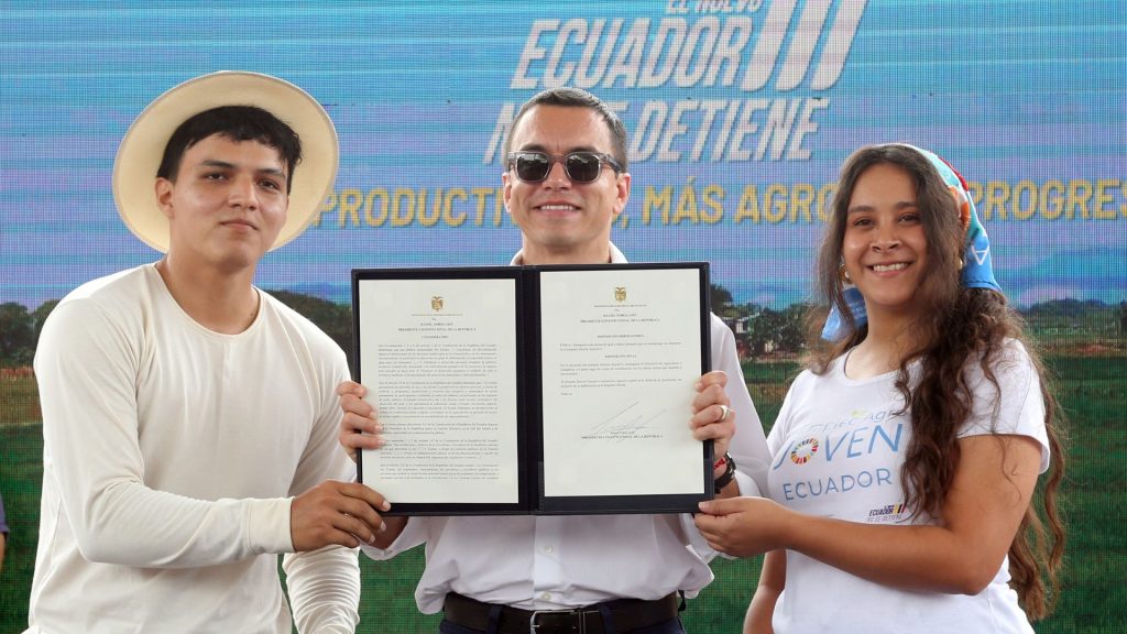 El presidente de la República, Daniel Noboa Azin, encabezó este miércoles 6 de agosto un acto en Daule, donde entregó beneficios a productores agrícolas y firmó el Decreto Ejecutivo que crea el Comité Interinstitucional por el Empleo AgroJoven, una iniciativa que busca impulsar la inclusión de jóvenes rurales en el sector agropecuario.