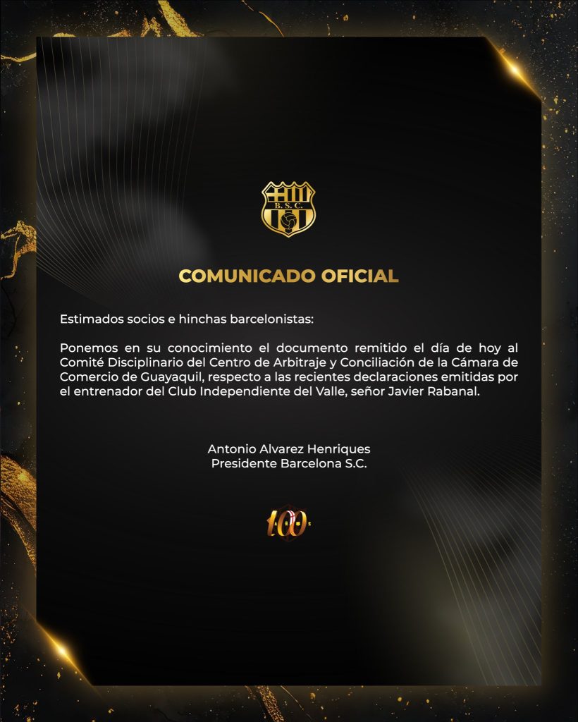 Barcelona SC busca que LigaPro tome medidas firmes contra estas declaraciones y establezca las sanciones correspondientes. El club reafirma así su postura de no tolerar ningún comentario que considere ofensivo o que atente contra su imagen institucional.