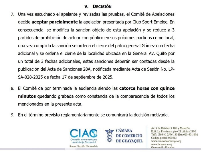 Emelec le rebajaron la sanción impuesta por los incidentes en el Clásico del Astillero, por la Liga Ecuabet 2025.