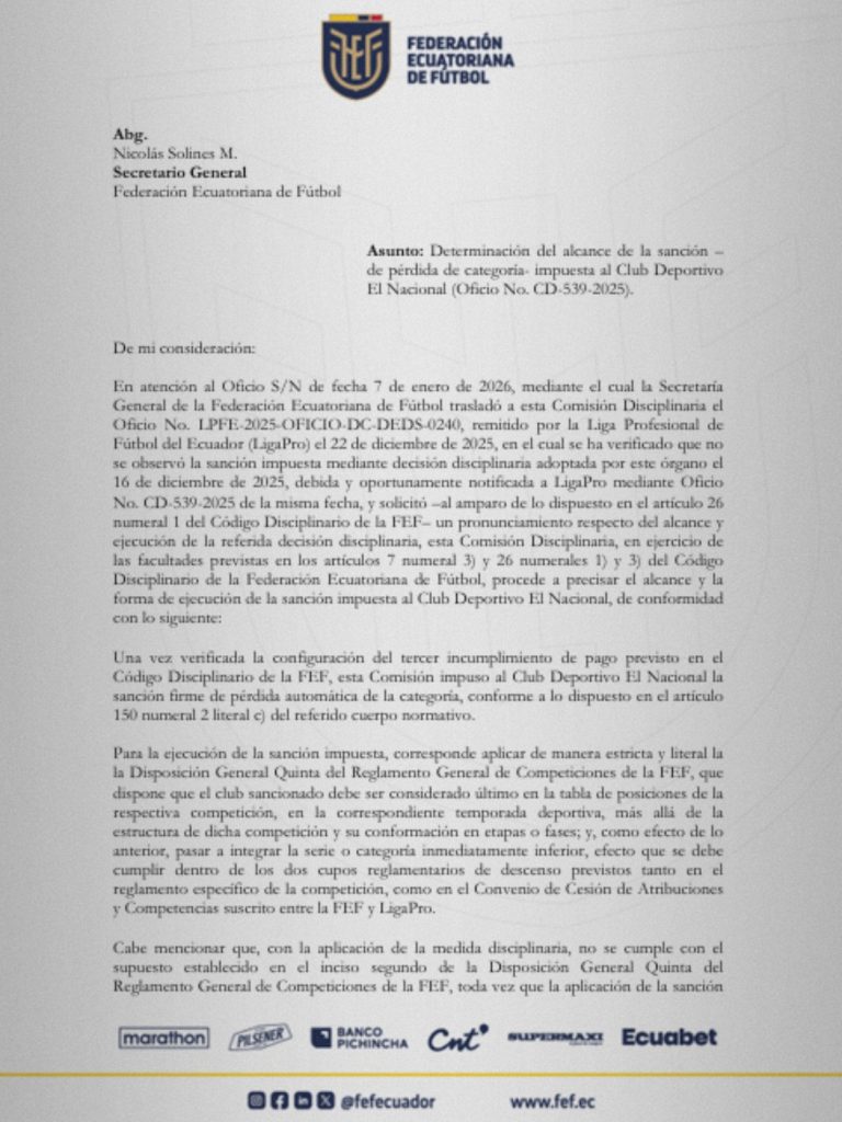 Según detalla el documento, El Nacional incurrió en un tercer incumplimiento de pago, situación que, de acuerdo con el Código Disciplinario de la FEF, deriva en una sanción automática y firme de pérdida de categoría.