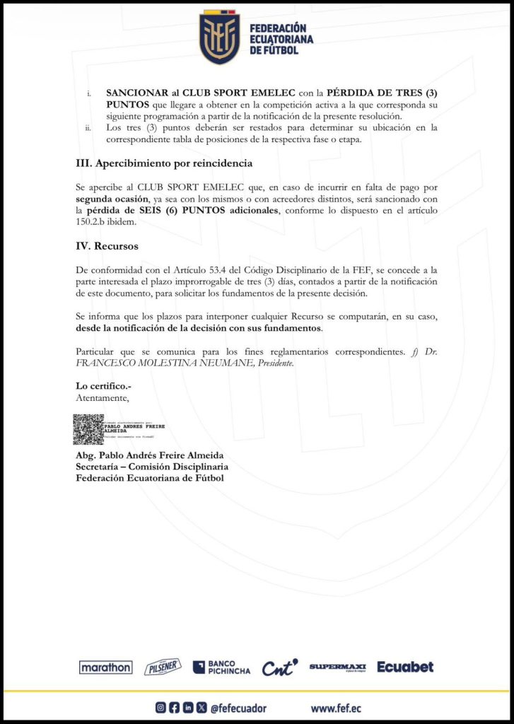 El oficio de la FEF incluye además un apercibimiento por reincidencia. En el texto se advierte que, en caso de registrarse un nuevo incumplimiento de pago, Emelec podría ser sancionado con la pérdida de seis puntos adicionales, una medida que agravaría su situación deportiva en el campeonato.
