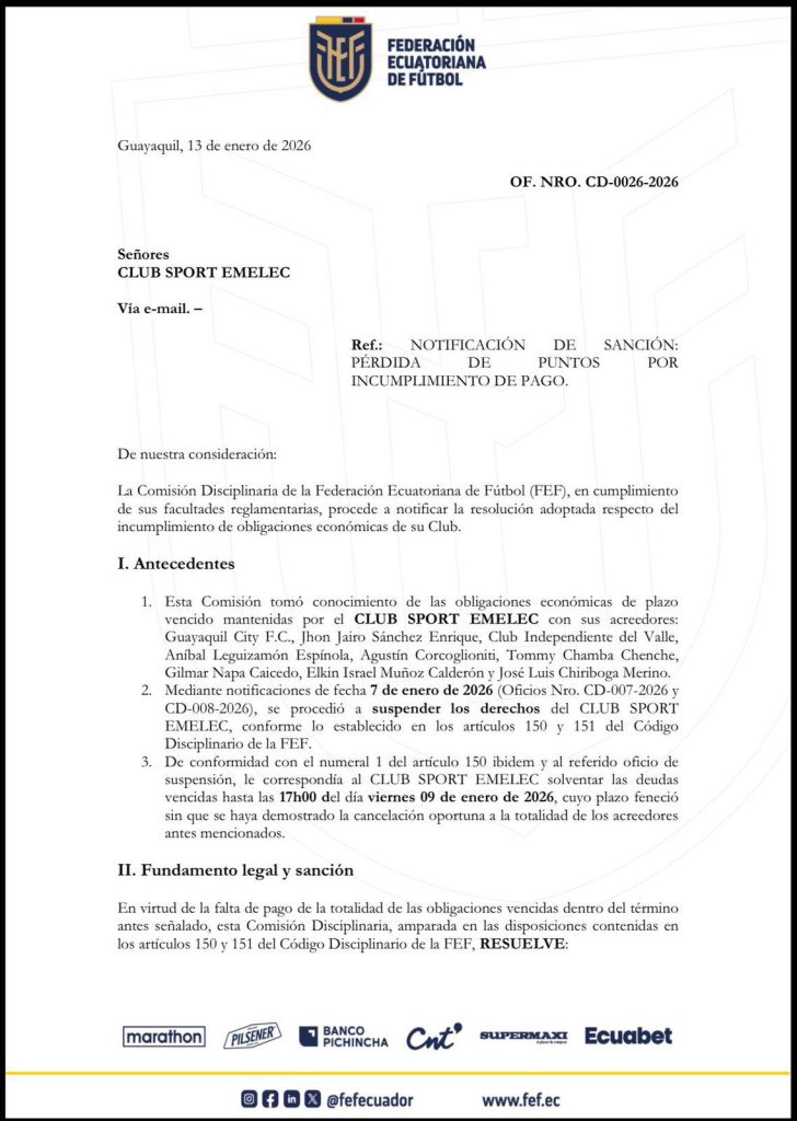 De acuerdo con el documento oficial, la sanción responde al incumplimiento de obligaciones económicas que Emelec mantiene con varios acreedores. El club ya había sido notificado con anterioridad y contaba con plazo hasta el 9 de enero de 2026 para cancelar la totalidad de las deudas.