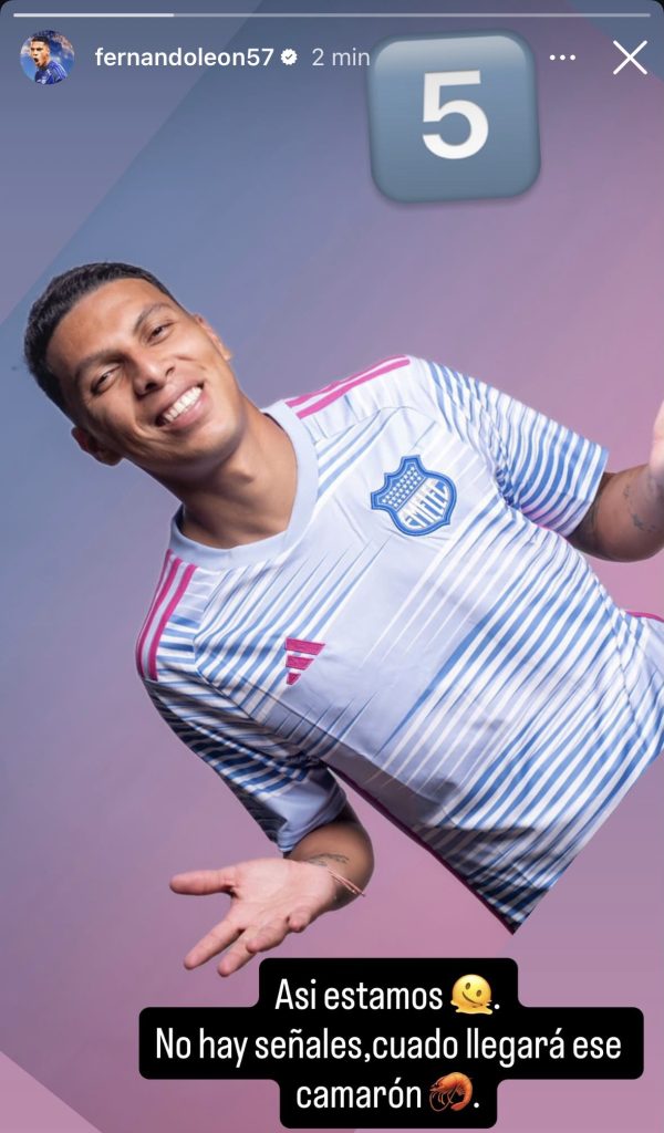 Este lunes, Luis Fernado León subió una foto suya con la camiseta de Emelec, acompañado de emojis y unas palabras. «Así estamos. No hay señales, cuándo llegará ese camarón», escribió el zaguero, donde además puso el número 5. Que, de hecho, es en alusión a los meses que la directiva azul le deben de sueldo.