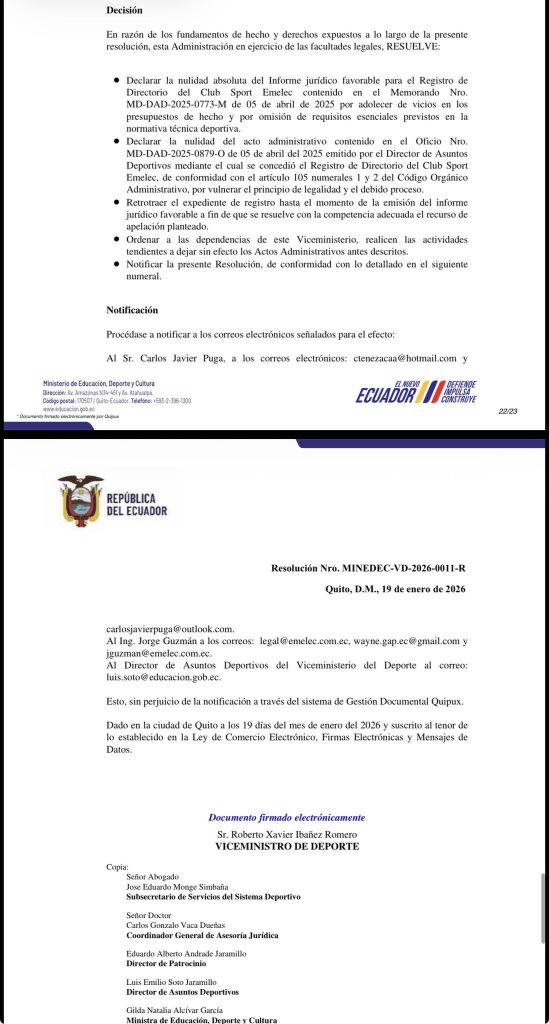 El Ministerio del Deporte declaró la nulidad absoluta del registro del Directorio del Club Sport Emelec, aprobado en abril de 2025 y encabezado por Jorge Guzmán. La decisión se tomó tras detectar irregularidades en el proceso administrativo, de acuerdo con el pronunciamiento oficial de la entidad gubernamental.